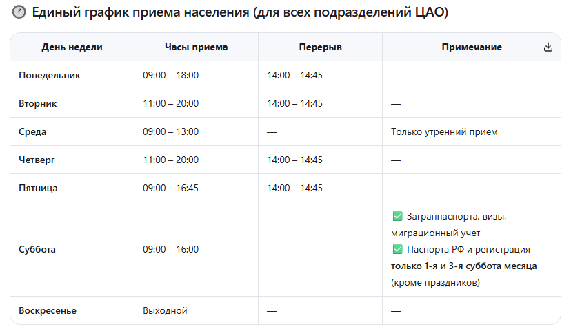 📌 Примечание: Графики работы и адреса могут изменяться. Актуальную информацию всегда уточняйте на официальных ресурсах МВД России. Данные в таблице актуализированы на основе публикаций с официальных сайтов и справочных ресурсов МВД.