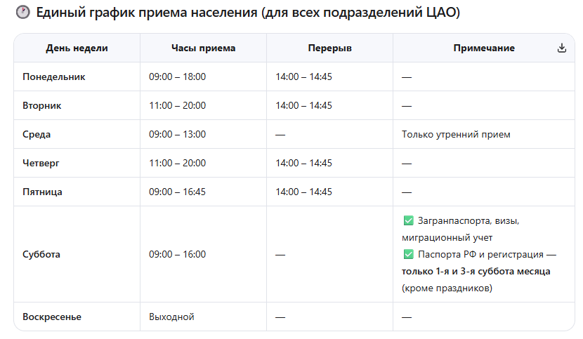 📌 Примечание: Графики работы и адреса могут изменяться. Актуальную информацию всегда уточняйте на официальных ресурсах МВД России. Данные в таблице актуализированы на основе публикаций с официальных сайтов и справочных ресурсов МВД.