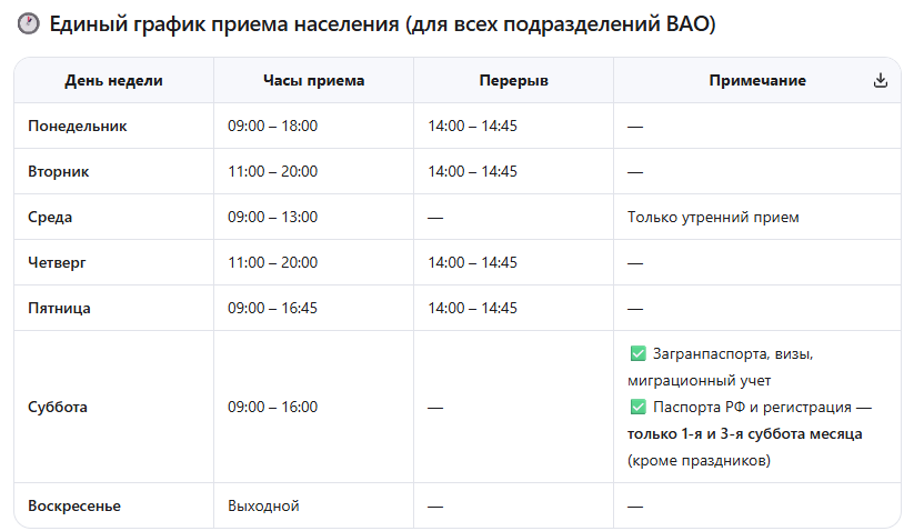 📌 Примечание: Графики работы и адреса могут изменяться. Актуальную информацию всегда уточняйте на официальных ресурсах МВД России. Данные в таблице актуализированы на основе публикаций с официальных сайтов и справочных ресурсов МВД.